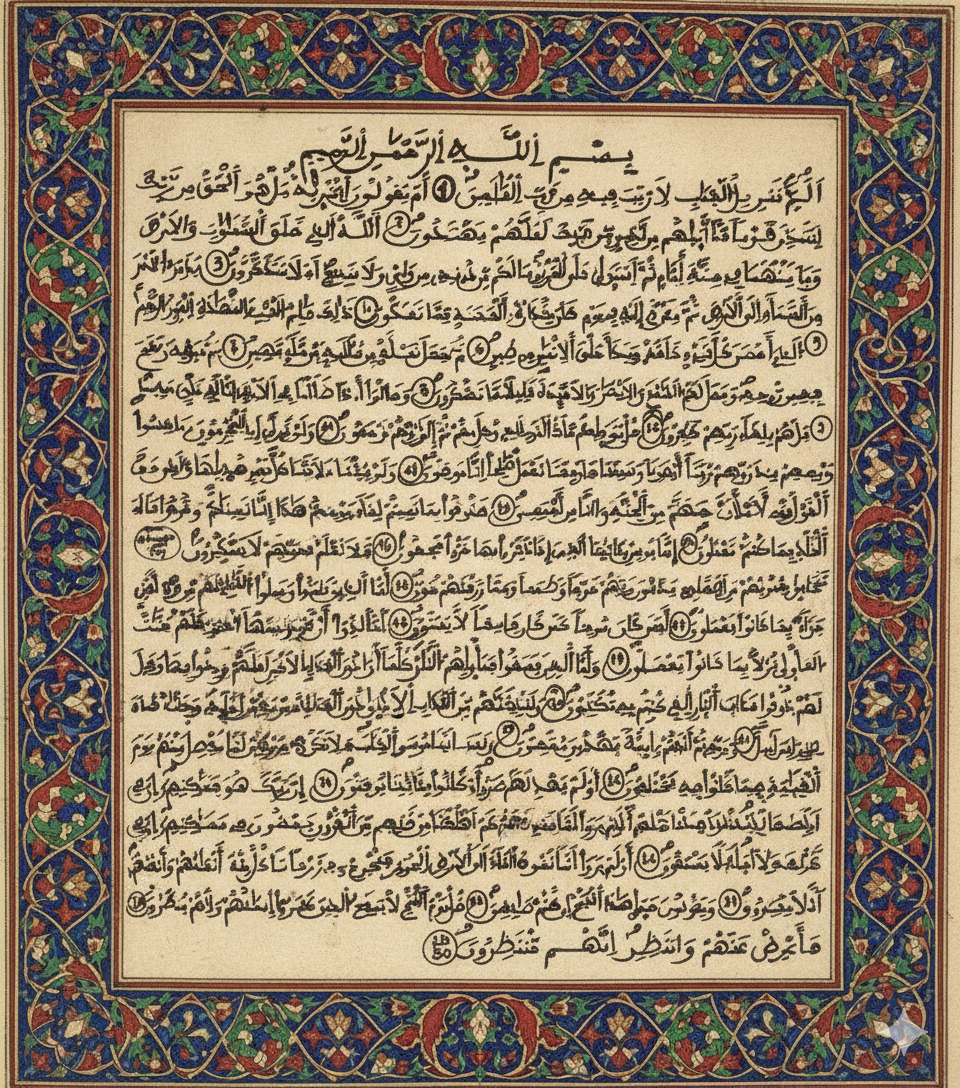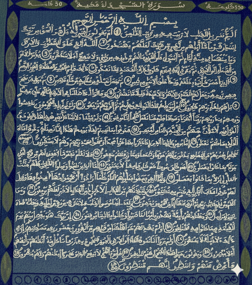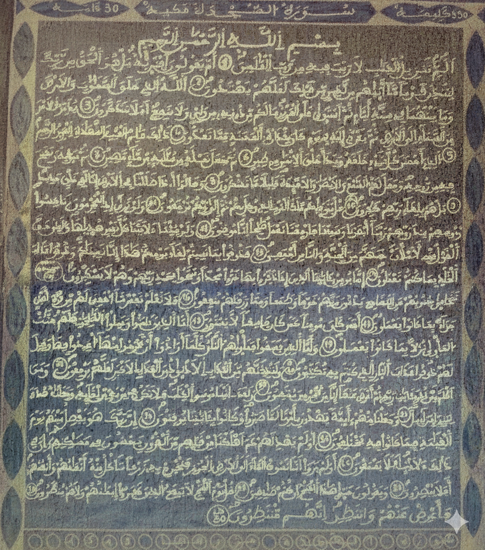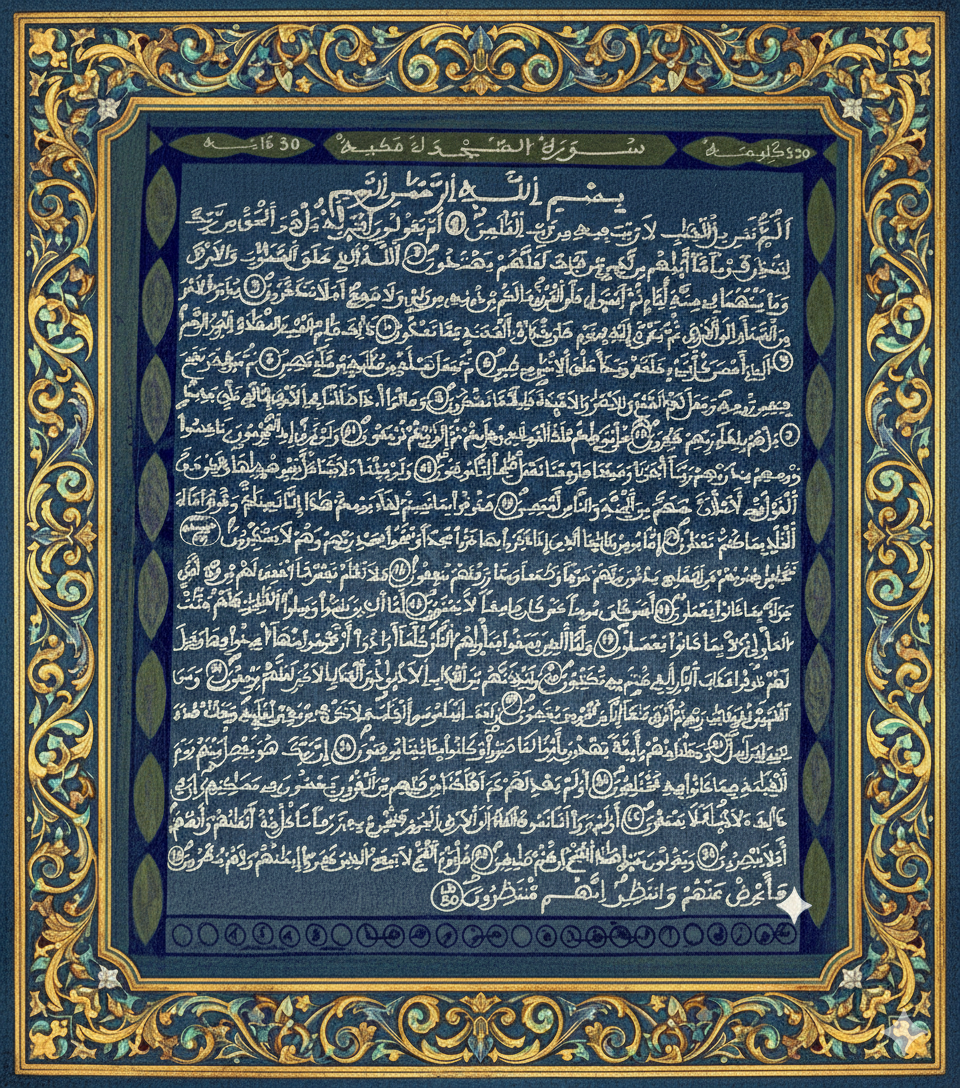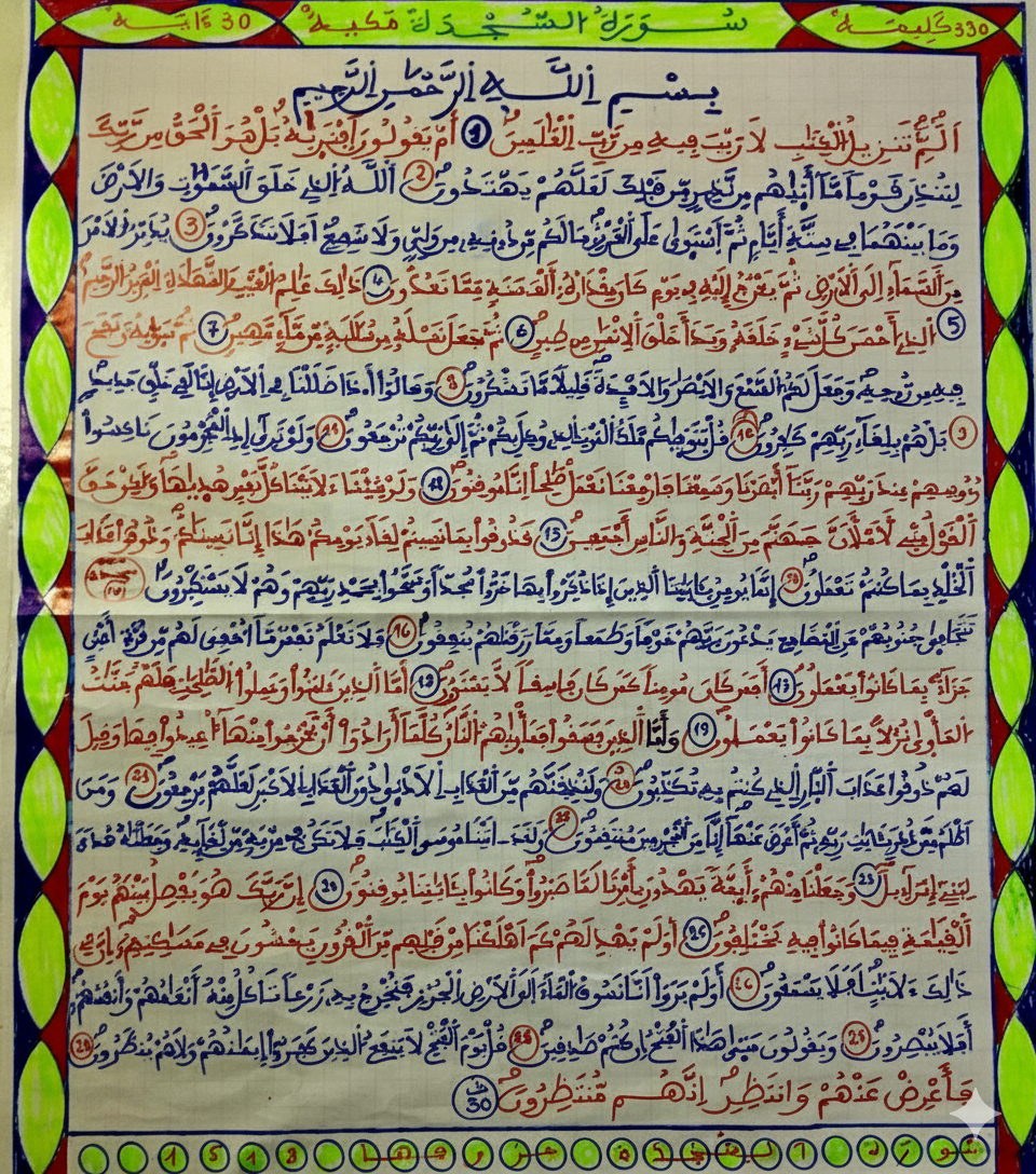 بفضل الله ومنّته، أضع بين أيديكم هذه اللوحة الفنية التي تجسد سورة السجدة كاملة، وهي ثمرة جهد متواصل جمعتُ فيه بين « شرف الكتابة » و »فن الزخرفة ». لم تكن مجرد عملية تدوين للآيات، بل كانت رحلة روحية وفنية حاولتُ من خلالها إبراز جماليات الخط العربي وتناغمه.