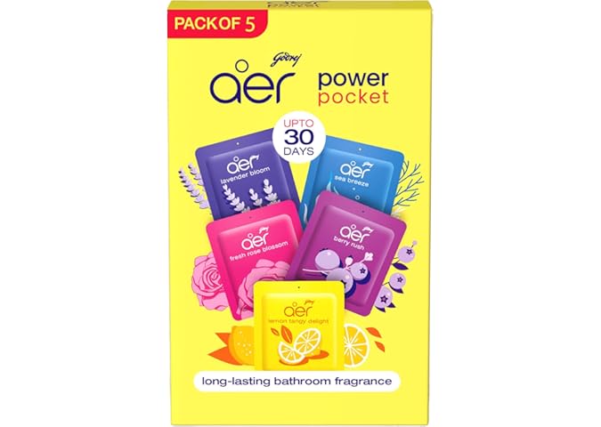 Godrej aer Power Pocket Air Freshener- Bathroom And Toilet Lasts Up To 30 Days Assorted Pack Of 5 (50G), Multicolour, 40017848